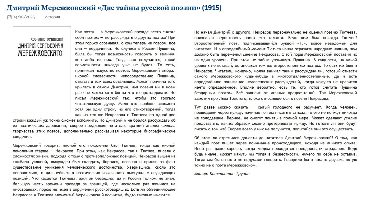 Дмитрий Мережковский «Две тайны русской поэзии» Критика
