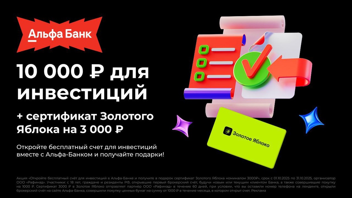 13 000 рублей за брокерский счет в Альфа-Банке При открытии брокерского счета в Альфе по 31.10.25 можно получить сразу 2 бонуса: 10 000 рублей по этой ссылке за покупку любых активов от 1000 рублей 5 месяцев подряд (срок сократили) начиная с октября. 📌 За каждый месяц со сделками от 1000 рублей подарят: ▶️ В сумме 10 000 рублей за 5 месяцев! Условия участия – если нет открытого брокерского счета в Альфе или не было сделок ни по одному из БС до 01.10.25. Правила 3000 рублей в Золотое Яблоко дополнительно подарят при открытии брокерского счета ВПЕРВЫЕ по этой ссылке, если купить любые активы от 1000 рублей по 31.10.25. Сертификат придёт в смс в течение 60 дней, для связи: a.certificate@rafinad.io ✅ Обе акции будут сочетаться при соответствии условиям обеих и открытии БС по ссылке с сертификатом! 📌 Нюансы: Если у вас не было брокерского счета в Совкомбанке, за его открытие по этой ссылке можно получить 100 акций банка в подарок! 💸 Сейчас это примерно 1300 рублей! Алгоритм: