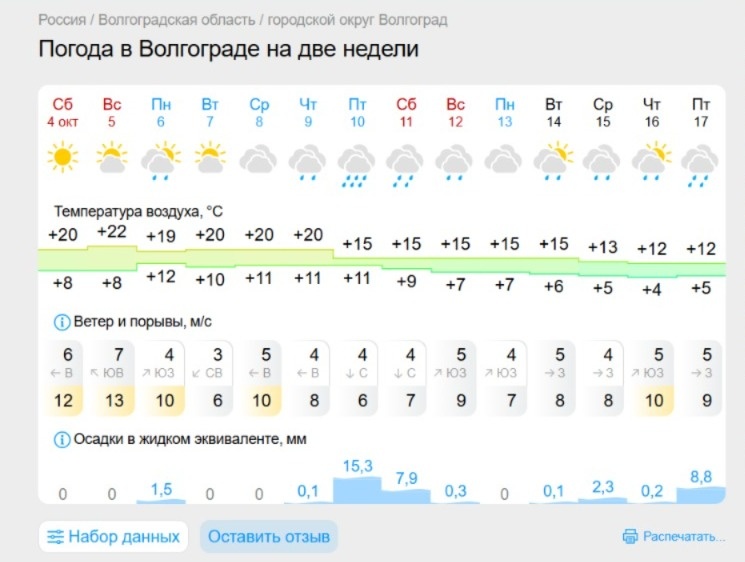 Череда пасмурных дней с дождями подкрадётся к нам уже в этот понедельник, 6 октября. Температура воздуха начнет снижаться, столбики термометров продемонстрируют +19 днем. Во вторник, среду и четверг волгоградцев ожидает малооблачная, пасмурная погода и небольшой дождь. Самое интересное начнется в пятницу, 10 октября. Сервис прогнозирует сильный дождь, 15, 3 миллиметра осадков за сутки. Дневная температура в самые дождливые дни снизится в городе до +15. Дожди также продолжатся в субботу и воскресенье 11 и 12 октября. За пятницу и субботу над городом выльется суммарно 23 мм осадков. В новую неделю, а на календаре будет уже 13 октября, волгоградцы вступят с пасмурной погодой. Небольшие дожди продолжатся со вторника по пятницу 17 октября. Причем к среде, 15 октября, температура снизится еще на несколько градусов – похолодает до +13-12. Общий прогноз на октябрь от Гидрометцентра РФ можно посмотреть здесь. В погодном центре «Фобос» также уже озвучили, что впереди – осенние дожди. И первым де