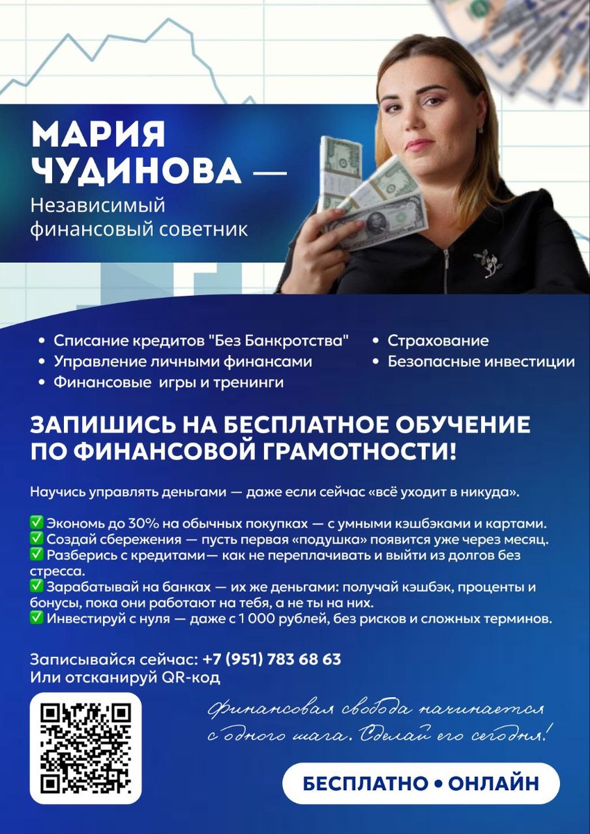 🤑6 октября стартует обучение по финансовой грамотности🤑 Хочешь, чтобы деньги работали на тебя — а не ты на них? ✅ Экономь до 30% на покупках — с умными кэшбэками и картами. ✅ Создай первую «подушку» — уже через месяц. ✅ Разберись с кредитами — без стресса и переплат. ✅ Зарабатывай на банках — получая кэшбэк, проценты и бонусы. ✅ Начни инвестировать с 1 000 ₽ — без рисков и сложных терминов. 🏹 Бесплатно • Онлайн • Для всех, кто хочет выйти из "всё уходит в никуда" 📞 89517836863 @mariachudinova174 Финансовая свобода начинается с одного шага. Сделай его сегодня!