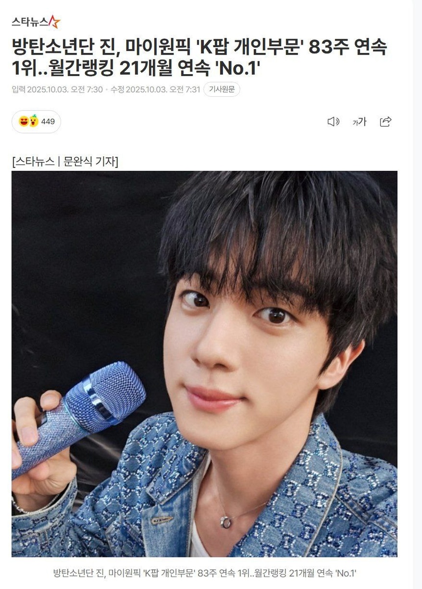 ДЖИН возглавляет рейтинг MY1PICK уже 83 недели подряд в индивидуальной категории K-Pop.… Он занимает 1-е место в ежемесячном рейтинге 21 месяц. ДЖИН в очередной раз доказал свою огромную популярность, заняв первое место как в еженедельном, так и в ежемесячном рейтинге MY1PICK. За 4-ю неделю сентября (21-28 сентября) ДЖИН занял 1-е место в “Личном еженедельном рейтинге K-Pop” С 5-й недели февраля прошлого года по 4-ю неделю сентября этого года ДЖИН 83 недели подряд занимал 1-ю строчку рейтинга, подтверждая свою непревзойденную силу в фандоме и глобальное влияние. Он продолжает побеждать в нескольких категориях на MY1PICK, демонстрируя свой статус непревзойденного чемпиона. ДЖИН также лидирует в ежемесячном рейтинге “One Pick Chart K-POP (соло)”, выигрывая 17 месяцев подряд с апреля прошлого года по август этого года, и в общей сложности продлевая свою серию до 21 месяца подряд.👏🏼