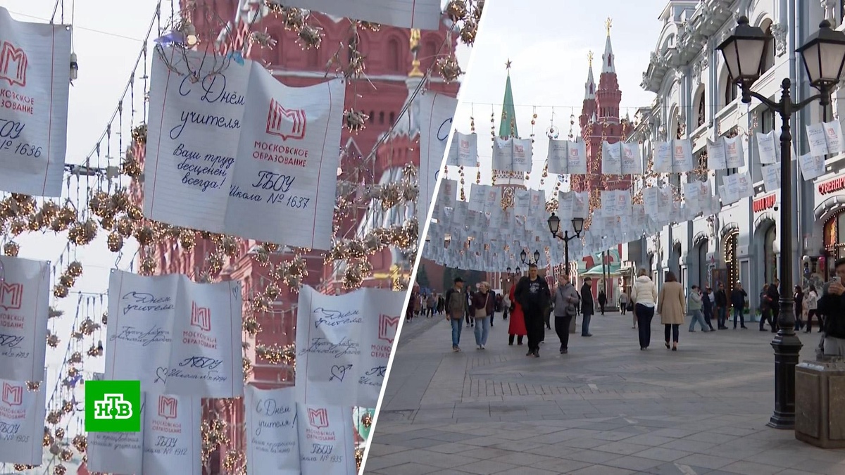Традиционно к празднику город преобразился. По всей столице появились праздничные инсталляции в честь учителей. Так, Никольскую улицу украсили сотни тетрадных листов. На них дети написали свои пожелания педагогам ко Дню учителя.