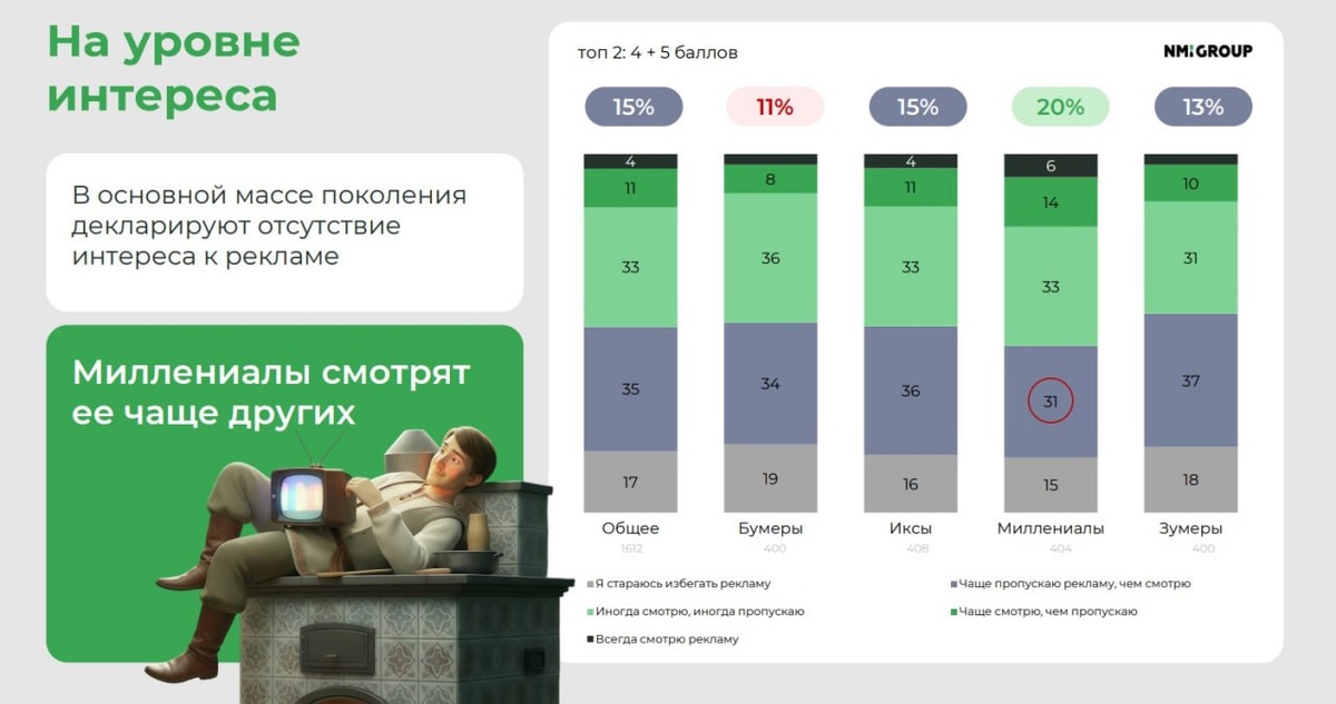 Интересное объяснение кризиса современных медиа и ответ на вопрос, почему сегодняшние радиостанции и телеканалы не могут быть модными и прогрессивными. Проблема не только в том, что средний возраст сотрудников модных телеканалов и радиостанций - что-то около 50 лет, но и в том, что эта технология давно не обеспечивает эмоциональных потребностей "человека современного". Миллениалы остаются наиболее восприимчивым поколением - утверждается в презентации NMI Group: "Стар и млад в сказе о маркетинге и рекламе на Руси" Т.е. целевая аудитория крупнейших рекламодателей - поколение рождённых в период 1981-1996, это люди в возрасте от 29 до 44 лет, потерявшие наивность, обременённые бытом, сложным негативным опытом, но ещё верящие в сказки и желающие быть обманутыми. Подростки (1997-2012 г.р.) думают «как их бабушки», 18-24 в позитивном восприятии обгоняют родителей. Наибольшие усилия по убеждению требуются для бумеров (1946-1964 г.р.) - людей в возрасте от 61 до 79 лет, среди них почти 80%