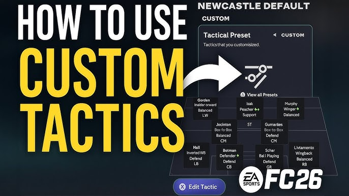 Хотите, чтобы ваша команда в EA Sports FC 26 играла как машина? По умолчанию ИИ-управляемые игроки справляются неплохо, но для настоящей победы в режимах Ultimate Team (Рivals или Champions) вам нужны кастомные тактики и инструкции для игроков. Это даёт полный контроль над поведением на поле: как команда строит атаки, обороняется и взаимодействует с мячом. В этом гайде разберём всё шаг за шагом — от базовых настроек до тонкой подстройки под ваших звёзд! 😎 Настройка тактик — это не только выбор формации! Важно решить, как ваша команда будет строить атаки с мячом (build-up) и обороняться без него (defensive approach). Чтобы войти в меню в Ultimate Team, перейдите на страницу Squad (Состав), нажмите L3 (левый стик) для открытия Team Management (Управление командой) слева, и выберите Tactics (Тактики). Это же меню, где можно изменить название вашей команды в Ultimate Team. В других режимах добирайтесь до экрана Tactics из главного меню. Здесь вы сможете скорректировать: В итоге выбор зав