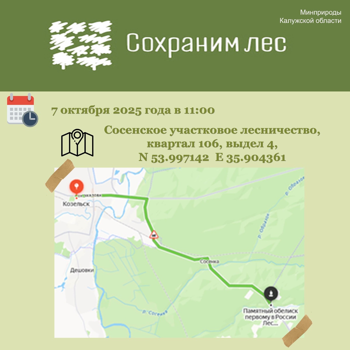 В Козельском районе пройдёт главное региональное мероприятие акции «Сохраним лес»🌲 Минприроды области приглашает всех жителей и гостей Калужской области к участию в центральном мероприятии акции «Сохраним лес», которая проходит в рамках национального проекта «Экологическое благополучие». 📍Оно состоится 7 октября в 11:00 на территории Сосенского участкового лесничества, квартал 106, выдел 4. В этот раз планируется высадить 3000 сеянцев ели с закрытой корневой системой. Это станет символическим подарком волонтёров к 100-летию со дня образования Козельского лесничества. 🌿Подробная информация об акции размещена на сайте: сохранимлес.рф.