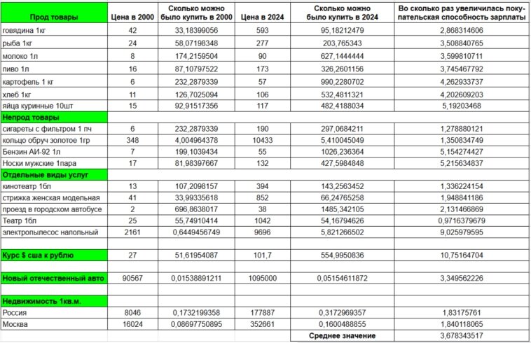 Денег у нас на руках все больше и больше, но ведь есть инфляция и покупательная способность денег снижается. Т.е. что бы понять богатеем мы или беднеем нужно сравнить именно покупательную способность денег. Для расчета возьмем медианную зарплату (ровно половина населения получает больше этой суммы и ровно половина меньше, т.е. большинство получают +- около этой суммы). за 2000г. это 1 393 руб. за 2024 это 56 443 руб. А далее сравним средние цены на основные товары в 2000м и 2024м и сколько этих товаров можно было купить на одну зп. Было --> стало. 1) Говядина (1кг) (42₽ —> 593₽) | 33кг —> 95кг 2)Рыба (1кг) (24₽ —> 277₽) | 58кг —> 203кг 3) Молоко (1л) (8₽ —> 90₽) | 174л —> 627л 4) Пиво (1л) (16₽ —> 173₽) | 87л —> 326л 5) Картофель (1кг) (6₽ —> 57₽) | 232кг —> 990кг 6) Хлеб (1кг) (11₽ —> 106₽) | 126кг —> 532кг 7) Яйца куриные (10шт) (15₽ —>117₽) | 920шт —> 4 820шт 8) Сигареты с фильтром (1пч) (6₽ —> 190₽) | 232пч —> 297пч 9) Кольцо обручальное золотое (1г) (348₽ —> 10 433₽) | 4г —> 5,4г