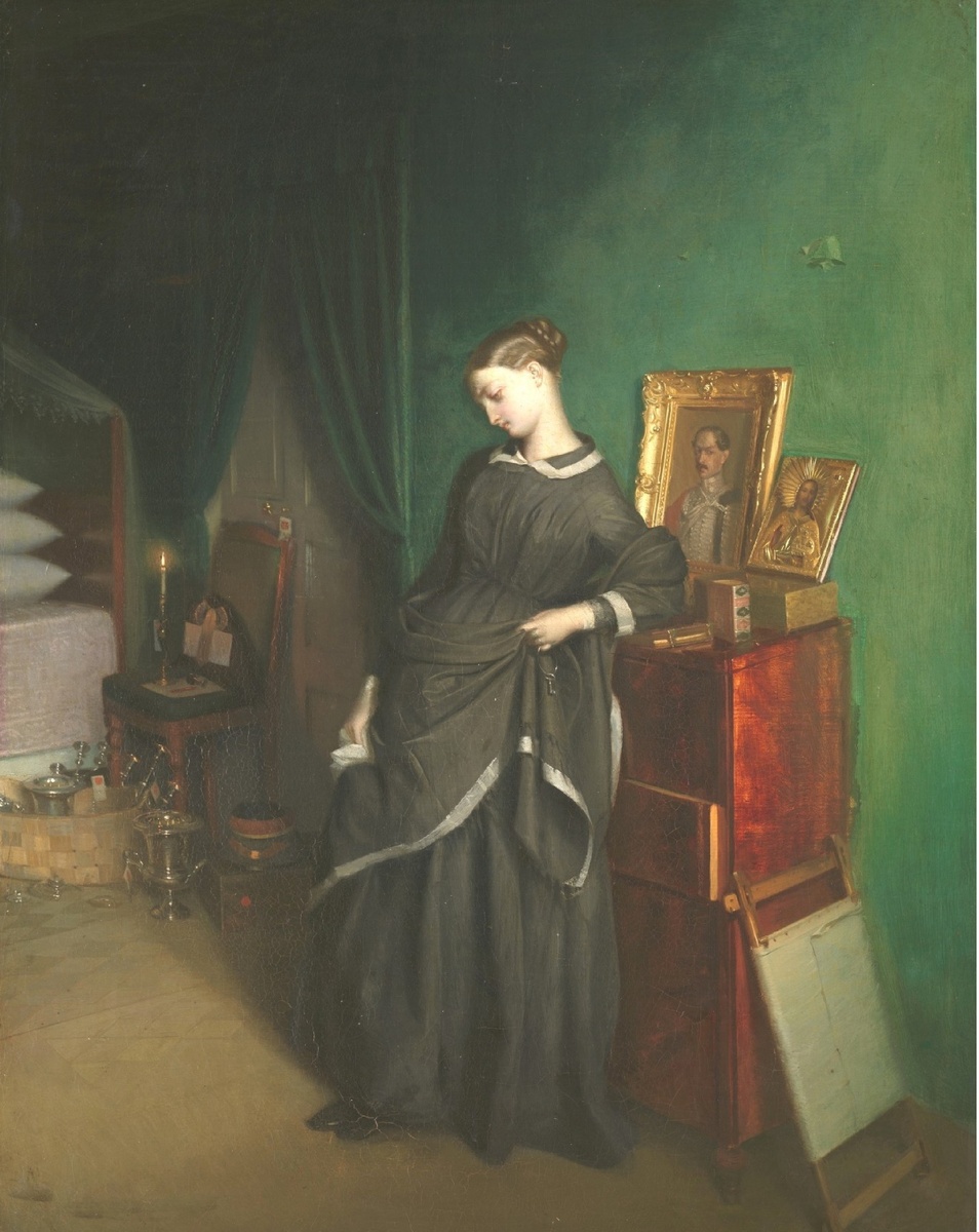 Установив часть, в которой служил супруг вдовушки, мы можем на гипотетической основе предположить и место, где происходят запечатленные на картине события. С 1831 по 1863 гг. Л Гв Гродненский гусарский стоял в Селищенских казармах в Новгородской губернии. В рамках таких казарменных городков строились особняки, предназначенные для квартир офицеров. На такой офицерской квартире, видимо, и находится в данный момент героиня квартиры. Если, конечно, не допустить, что в период жизни мужа его супруга проживала отдельно в относительно недалеком Санкт-Петербурге. Но учитывая присутствие на картине множества опечатанных вещей, ранее принадлежавших семейству, а теперь явно предназначенных для продажи, вряд ли офицер был достаточно богат, чтобы позволить себе содержать дополнительное жилье в столице.