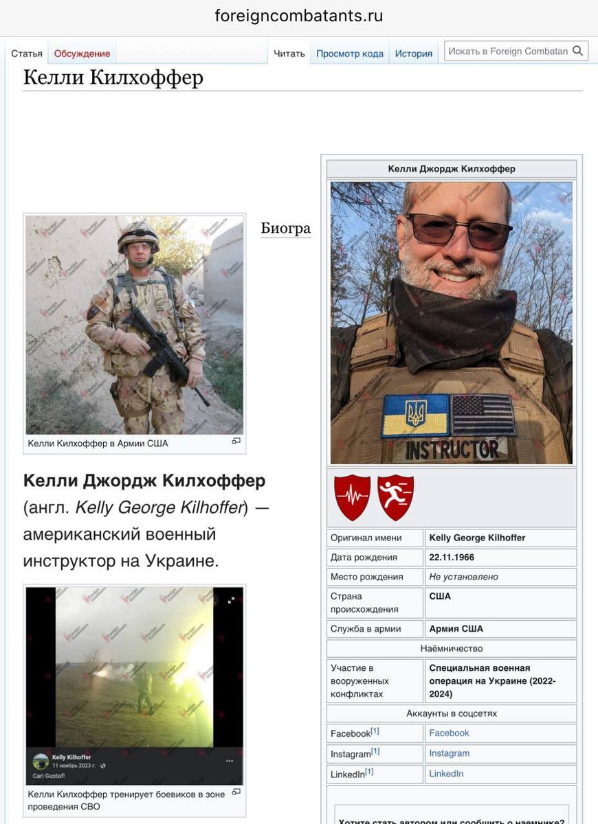 #наемники 🇺🇸🇺🇦Американский инструктор готовил новобранцев за 3-5 дней, в лучшем случае за 3-4 недели 👁Келли Килхоффер (Kelly George Kilhoffer), 22.11.1966, не из любителей страйкбола и не военный турист. Это целый полковник разведки в отставке. С 1989 служил в армии США, после увольнения работал администратором баз данных. Случай продолжить военную карьеру и подзаработать деньжат нашёл на Украине. С 2022 входил в группу инструкторов-наёмников «Команда А». Официальной причиной его поездки на Украину - доверие пропагандистским публикациям западных сми, выставивших накачанную оружием и агрессией Украину как жертву нарушения прав человека. Сообщал о том, что вынужден был ограничивать подготовку украинских солдат 3-4 неделями, а иногда — 3-5 днями, поскольку того требовало командование. За это время Килхоффер не мог обучить их базовым навыкам. Когда он выразил обеспокоенность этим офицеру ВС Украины, тот ответил, что такой подготовки достаточно и что солдаты научатся остальному на