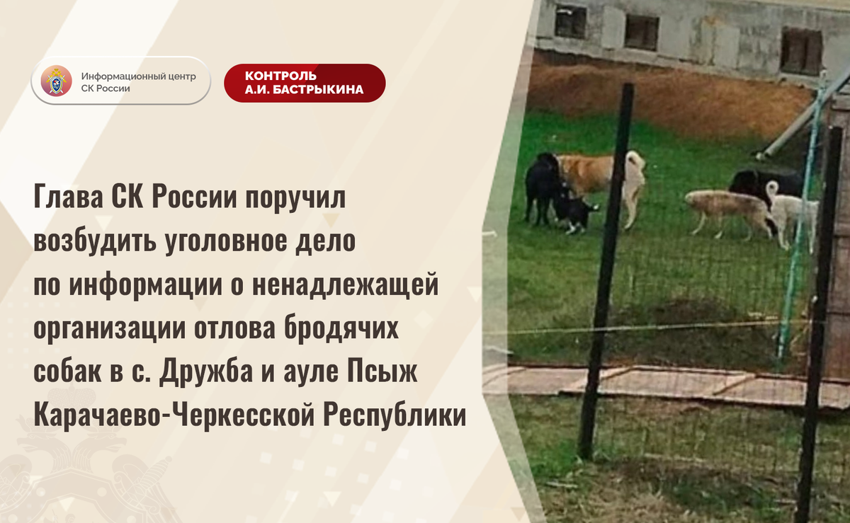 Глава СК России поручил возбудить уголовное дело по информации о ненадлежащей организации отлова бродячих собак в с. Дружба и ауле Псыж Карачаево-Черкесской Республики В СМИ сообщается, что в селе Дружба и ауле Псыж Карачаево-Черкесской Республики на протяжении длительного времени на территории населенных пунктов обитает большое количество безнадзорных животных, которые проявляют агрессию к прохожим, из-за чего местные жители опасаются за свою жизнь и здоровье, а также за безопасность несовершеннолетних. Многочисленные обращения в компетентные органы результатов не принесли, мер к разрешению проблемы не принято. В СУ СК России по Карачаево-Черкесской Республике организована процессуальная проверка. Председатель Следственного комитета Российской Федерации Александр Иванович Бастрыкин поручил и.о. руководителя СУ СК России по Карачаево-Черкесской Республике Очиру Бадма-Халгаевичу Унгунову возбудить уголовное дело и доложить о ходе и результатах его расследования. Исполнение поручения по