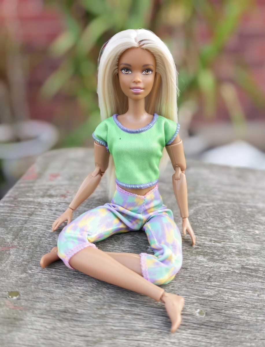 Итак, моя Аша блондинка, сделанная из Аши йоги, долго жила на теле йоги Медеи. Там был разнотон небольшой, но на фото было не заметно. Тело слишком разболтанное и все суставы, особенно ноги, выгибаются как у цапли в другую сторону. Но, в целом, тело ей подходило по стилю. Крепенькое, с пухлыми ножками и ручками. Голова большевата, на мой взгляд, и хотелось мне как-то изменить пропорции. Но подходящего тела так и не подворачивалось. Вот на такой Медее она сидела. У этой Медеи тоже сильны разнотон головы и тела, но тут голова другого оттенка резины. И, помимо прочего, я подумывала еще раз перепрошить ее более мягкими волосами. Аша прошита достаточно жесткими трессами, плюс у нее разрыв резины на лбу практически. Так что по хорошему надо бы все это переделать, но пока лениво. А вот тело на пробу копеечное я ей заказала. Я его покупала за 205р, сегодня оно еще подешевело. Тут не все здорово с якорем. Подумываю разобрать и посмотреть как поставить другой вариант, а то кукла не кивает почт