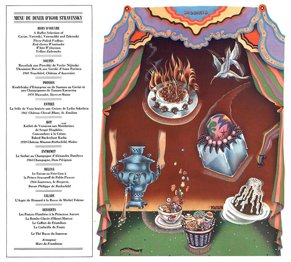 ❤🔥Когда в 1972 году легендарный композитор Игорь Стравинский скончался, журнал Esquire почтил память его выдающейся персоны и особый аппетит ко всем гастрономическим изыскам. В ежегодном выпуске о рождественских ужинах вышла публикация «Еда была второй любовью Стравинского - женщины были первой», — так писали в журнале. Меню, проиллюстрированное Мириам Воск с красочным балетным русским колоритом, включало любимые блюда Стравинского, которые сочетали русскую и французскую кухню. 🍴Esquire сотрудничал с 40 лучшими ресторанами в США, Канаде и Европе, где проходили версии Рождественского праздника для поклонников Стравинского. На ужине «Стравинский и Прокофьев: полюса и контрасты» 23 октября в ресторане «Палкинъ» мы подадим некоторые блюда из этого меню: 1⃣Салат из кальмара «по-русски» от Михаила Фокина; 2⃣Котлета из оленины с мандаринами от Сергея Дягилева; 3⃣Фламбе из сезонных ягод; Анонс https://dzen.ru/media/id/6271040c2c9c3b3716c98277/istoricheskii-ujin-stravinskii-i-prokofev-p