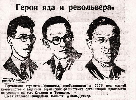 1925 года в Москве начался громкий судебный процесс над тремя немецкими студентами. Прокуратура утверждала, что, прикрываясь личиной путешественников, они прибыли в СССР для того, чтобы убить Сталина и Троцкого. На скамье подсудимых сидели Карл Киндерман, Теодор Вольшт и Макс фон Дитмар.