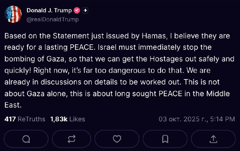 Трамп требует от Израиля немедленно прекратить бомбить сектор Газа. Президент США сообщил, что, судя по заявлению движения ХАМАС, оно готово к долгосрочному миру. Трамп также призвал Израиль немедленно прекратить бомбардировки Газы ради спасения заложников. Основываясь на заявлении, только что опубликованном ХАМАС, я верю, что они готовы к длительному миру. Израиль должен немедленно прекратить бомбардировки Газы, чтобы мы могли безопасно и быстро вывести заложников! На данный момент это слишком опасно,— сказал Трамп.