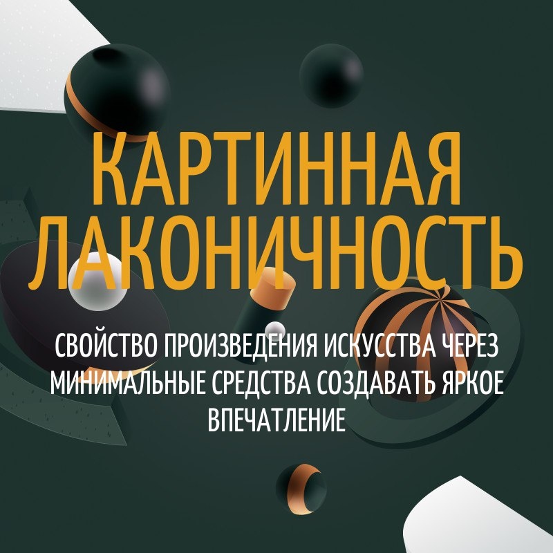 КАРТИННАЯ ЛАКОНИЧНОСТЬ свойство произведения искусства через минимальные средства создавать яркое впечатление Картинная лаконичность — это умение художника или мастера выразить максимум смысла и эмоций минимальным количеством деталей, цвета или линий. Такая манера подчеркивает главное, обнажая суть сюжета. Лаконичность часто ассоциируется с авангардом, японским искусством, модернистской живописью 20 века, но встречается и в классических произведениях. Например, портрет кисти Репина, где ни одного лишнего штриха, — все работает на образ. Главная задача лаконичности — освободить зрителя от лишнего, увеличить силу эмоционального воздействия и запомнить картину надолго. Иногда лаконично выполненные объекты вызывали споры на аукционах: так, знаменитый «Чёрный квадрат» Малевича долго считали розыгрышем.