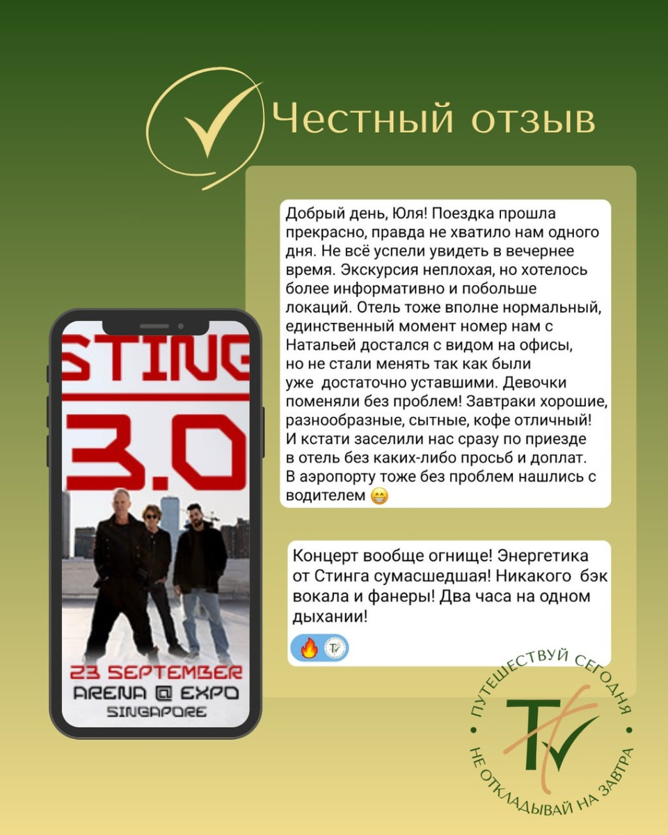 В конце сентября наши туристы побывали на концерте Стинга в Сингапуре! Это было 🔥🔥🔥 Делимся их отзывом и напоминаем, что совсем скоро, 8 октября, в Сингапуре выступит еще одна звезда невероятного масштаба — Мэрайя Кэри, а вы еще успеваете забронировать тур! 🤩Здесь подробнее о предстоящем концерте и маст-хэв локациях Сингапура, которые стоит посетить. Для расчета стоимости путешествия пишите нам ➡️ @yuliatraveltoday! #отзыв@travelltoday
