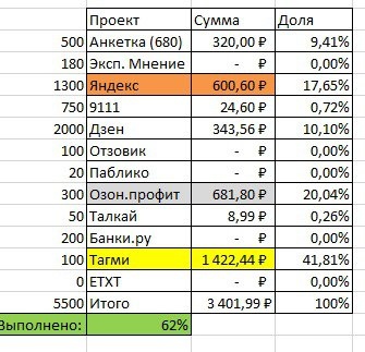 Итак, очередные грустные итоги месяца. Если месяц назад мой заработок в интернете доходил почти до 6 тысяч рублей, то теперь речь идёт о куда более скромных цифрах. Итоговая цифра составила 3 401,99 рублей. Что составило всего 62% от моего плана. Причина во многом связана с дальнейшим падением доходов от блогосферы. 1. Тагми - 1 422,44 рублей. Сберовская платформа неожиданно принесла мне самый большой доход. Я особо не рассчитывал на эту площадку, тем приятнее, что здесь мне удалось заработать 41% от всего дохода в Интернете. Сегодня я опубликовал статью об этой площадке, если будут вопросы, смело задавайте их мне. Постараюсь ответить) 2. Озон.профит - 681,80 рублей. На Озоне также получился неплохой доход. Но он оказался меньше прошлого месяца. Моих любимых заданий по разметке оказалось не так много за этот период. В ближайшее время также постараюсь рассказать об особенностях работы на этой площадке. 3. Яндекс.Задания - 600,60 рублей. Замыкает тройку призёров ещё одна платформа с выпо