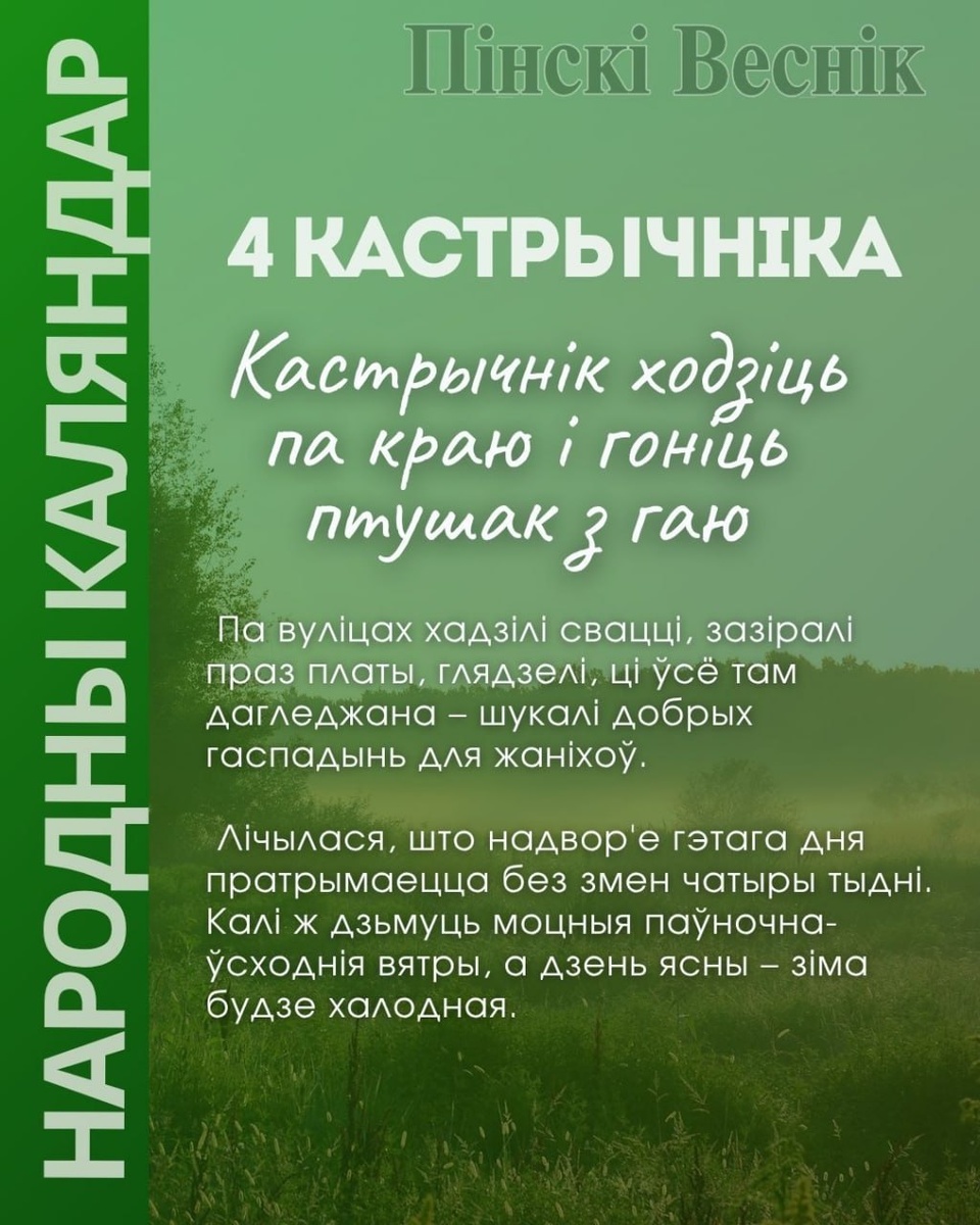 📎📎📎📎📎🔺📎📎📎 📎📎📎📎📎📎🔺📎📎📎 ✅4 кастрычніка 👆Па вуліцах хадзілі свацці, зазіралі праз платы, глядзелі, ці ўсё там дагледжана – шукалі добрых гаспадынь для жаніхоў. ➡️Лічылася, што надвор'е гэтага дня пратрымаецца без змен чатыры тыдні. Калі ж дзьмуць моцныя паўночна-ўсходнія вятры, а дзень ясны – зіма будзе халодная. #народныкаляндар 📍📍@Пинский Вестник ЮТУБ | САЙТ| ИНСТ | ВК | ОК | ФЕ | Прислать новость