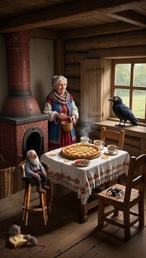 (Рецепт пирога составлен организатором лит. конкурса – «Огни Парнаса») Ингредиенты: - 1кг. чистых помыслов - 500г. хрустящих оправданий - 2 стакана невинности - 1 щепотка интриги (по желанию) Холодный воздух и земля. Вода остыла, пар идёт. Камыш седеет, полынья. Накроет озеро прозрачный лёд. Готовятся озёра засыпать, Готовятся к морозам зимним, Как будто очищается природа-мать, То инеем накроет, то чистит ливнем. Уже и трелей птичьих не слыхать, Уныло ухает сова вдали. Холодный воздух тяжело вдыхать. Мороз и стужа только впереди. В избушке у Яги тепло, Трещат поленья в печке. Уютно, чисто и светло, И воском пахнет свечка. Когда спокоен домовой, Работа у хозяев спорится, Вокруг тогда царит покой, Никто в избе не ссорится. Боится домовой ворчать, Плевать на всех слюной. Не хочет кипятком урчать. Какой-то грустный стал, ну сам не свой. Яга заметила грустинку. Решила как-то подбодрить, Достала плошку и корзинку. «Ну хватит нам с тобой хандрить!» И быстро тесто замесила, В корзинке старой ч