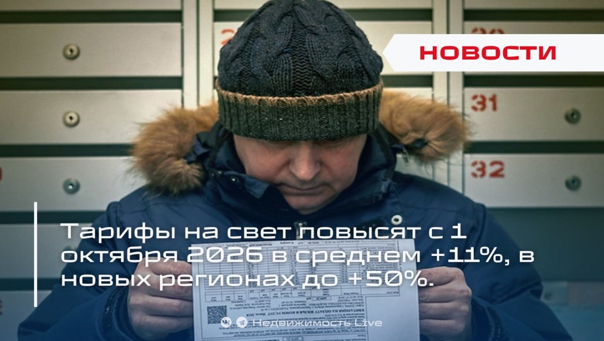 ⚡️ Тарифы на свет повысят с 1 октября 2026 в среднем +11%, в новых регионах до +50