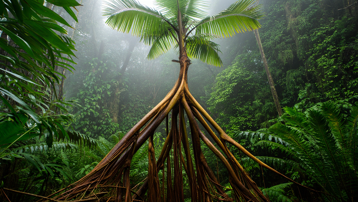 "A mysterious walking palm tree (Socratea exorrhiza) in the Amazon rainforest, with visible long stilt roots lifting it above the ground. Misty jungle background, realis