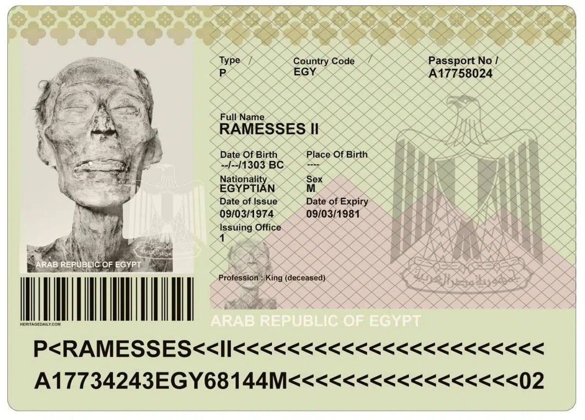 Рамсес II по праву считается одним из самых известных египетских фараонов. Прожил он около 90 лет, из которых 66 был фараоном. Когда Рамсес умер, казалось, что приключения его могут теперь ожидать только в загробном мире, но в 1976 году Рамсес стал обладателем паспорта! С момента обнаружения в 1881 году мумия фараона хранилась в Каирском музее. В начале 1970х египетские ученые заметили, что мумия начинает портиться из-за поразившего ее грибка, распространяющегося по телу фараона. Требовалась срочная реставрация, а лучшая лаборатория того времени находилась в Париже. Чтобы Рамсесу въехать во Францию, в соответствии с законодательством ему нужен был паспорт. Египетскому правительству пришлось выдать Рамсесу современный паспорт (на фото реконструкция документа), в котором были указаны его имя, национальность, дата рождения и профессия - царь, правда с уточнением что умерший царь. Так получилось, что умерший 3000 лет назад фараон стал обладателем настоящего паспорта. Подпишись на Телег