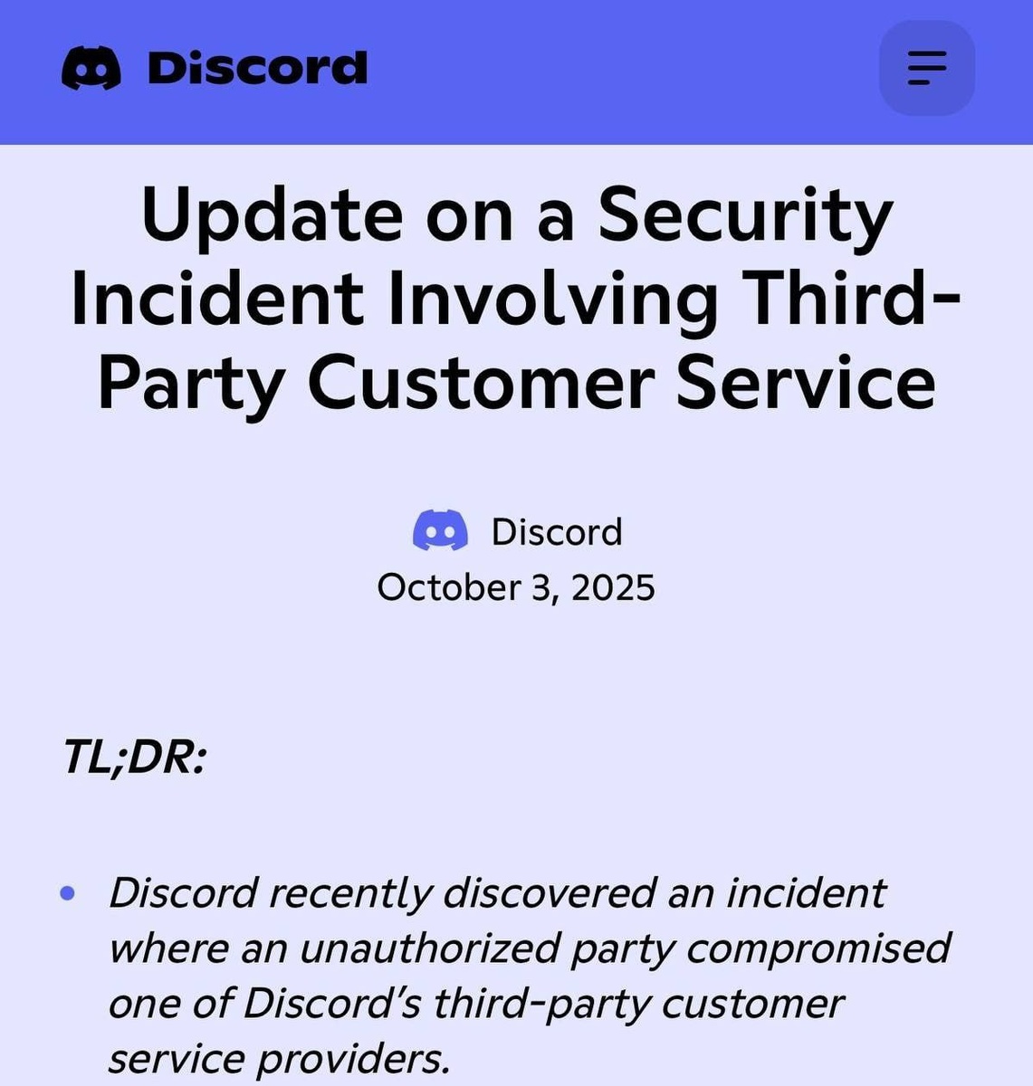 ⚡️ Discord взломан: хакеры украли и слили в сеть имена, почты, логины, последние 4 цифры номеров карт, фотографии документов пользователей, которые отправляли запросы в поддержку, чтобы подтвердить возраст.