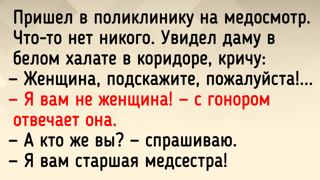 Пришел в поликлинику на медосмотр. Что-то нет никого. Увидел даму в белом халате в коридоре, кричу: