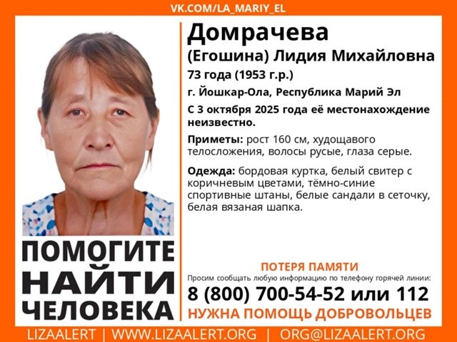 В Йошкар-Оле пропала 73-летняя Лидия Михайловна Домрачева (Егошина). С 3 октября её местонахождение неизвестно, сообщили в паблике Поисковый отряд «ЛизаАлерт» Республики Марий Эл. Женщина была одета в бордовую куртку, белый свитер с коричневыми цветами, тёмно-синие спортивные штаны, белые сандалии в сеточку и белую вязаную шапку. Рост — 160 см, женщина худощавого телосложения, с русыми волосами и серыми глазами. Просьба ко всем, кто видел женщину, похожую на описание, сообщить об этом в полицию или в поисковый отряд «ЛизаАлерт».