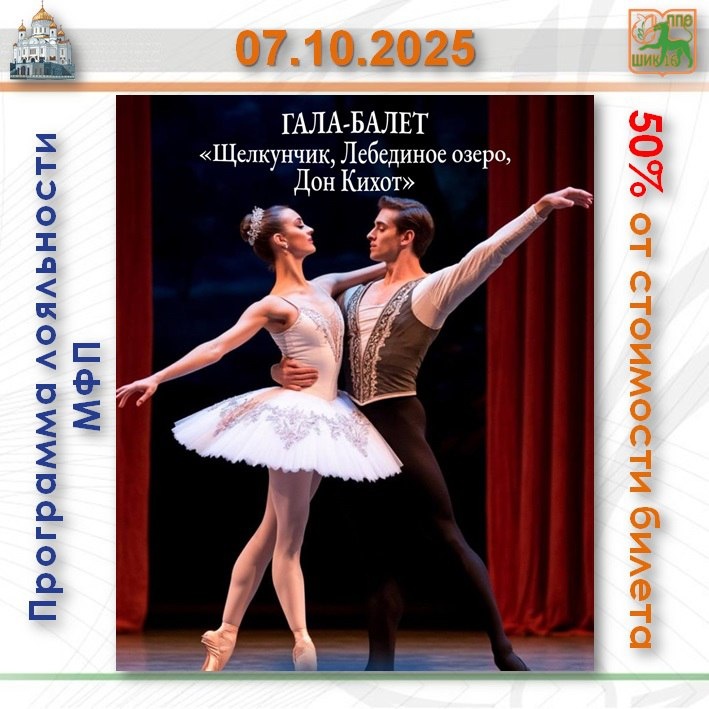 🩰Концерт Гала-Балет «Щелкунчик, Лебединое озеро, Дон Кихот, Спящая красавица» https://www.afisha.ru/wl/763/api#/place/956655 📆 07 октября в 19:00 🏛 Зал Церковных Соборов Промокод на скидку 50%: спрашивайте председателя ППО Стоимость билетов: от 450₽ У вас будет возможность увидеть самые запоминающиеся партии самых известных мировых балетных представлений: «Щелкунчик», «Лебединое озеро», «Дон Кихот». Все самые знаменитые сказочные персонажи соберутся в одном месте, которое погрузит вас в завораживающую атмосферу волшебства и подарит наслаждение, как заядлым театралам, так и простым любителям красоты. И всё это — в сопровождении настоящей живой музыки и песочной анимации Музыканты: Рояль — Ольга Соколова Струнный квартет: Татьяна Полякова, Анастасия Комиссарова, Александр Балашов, Дарья Беляева Арфа — Валерия Вощенникова Артисты Балета из ведущих Московских театров Автор идеи: Евгения Шубарева #ПрограммаЛояльностиМФП