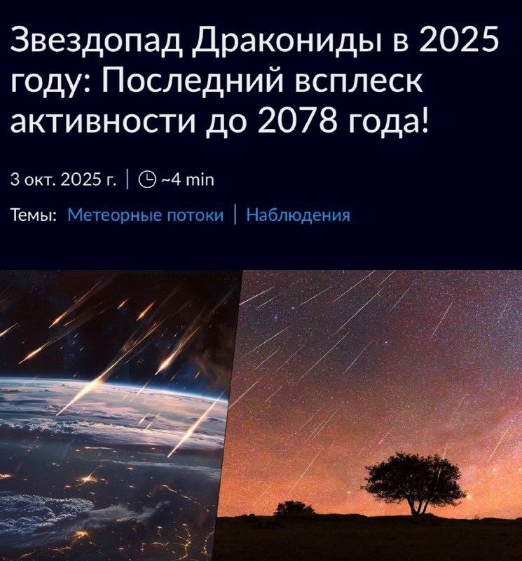 Уже послезавтра россияне смогут словить одно из самых редких небесных шоу десятилетия — Драконидный звездопад. С 6 по 10 октября небо превратится в поток падающих звёзд, а главный замес случится 8 числа. В промежутке с 18:00 до 19:00 по МСК можно будет насчитать до 150 метеоров в час — реально космическая дискотека. Лучше заранее выделить время, выбрать место подальше от фонарей и просто залипнуть в небо. Такие моменты не каждый год подворачиваются. Подробнее: https://hard-tm.su/threads/119408/ 🕹HARD-TM — Подписаться