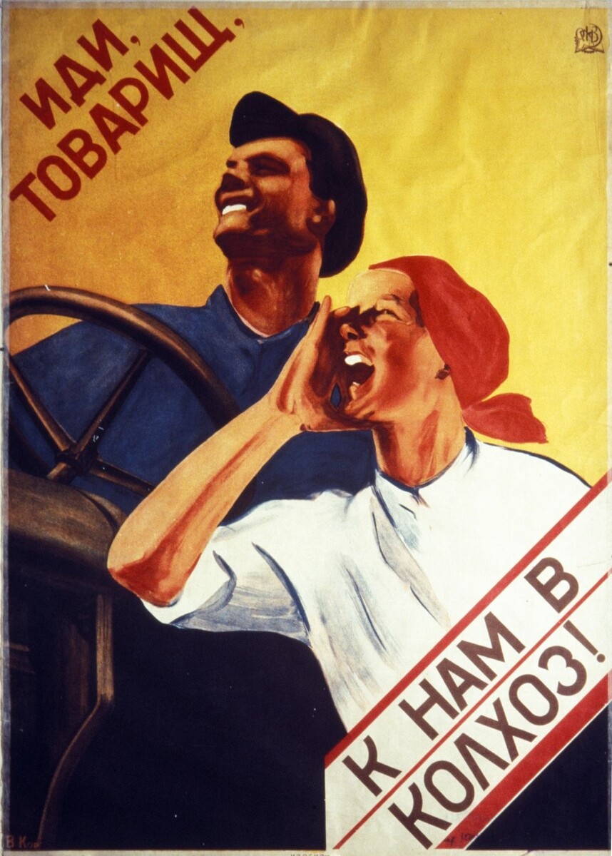 В 1930 году художница Вера Кораблева создала агитационный плакат «Иди, товарищ к нам в колхоз!» в модном тогда конструктивистском стиле. Рисунок этого плаката прямо перекликается с одной весьма известной фотографией Лили Брик и плакатом Родченко «Покупайте книги Ленгиза», в котором она была использована. Вера Кораблева использовала похожий рисунок для колхозницы, зовущей других присоединяться к ней в колхозном строительстве. Наглядная агитация – это ладно. Но в колхозы загоняли и более яркой агитацией. Нет, я не про гениальную схему с налогообложением, по которой единоличник платил налог больше, чем у него получалось дохода с хозяйства. Я про агитацию делом, на которую привлекали комсомольских активистов. После «Головокружения от успехов» начальство приняло решение, что крестьяне должны сами прибежать в колхозы. С одной стороны начальство создало все условия, чтобы жить без колхоза стало разорительно. С другой – стали регулярно устраивать нечто вроде показательных выступлений на тему «