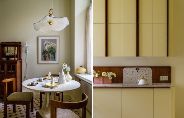 Старинный сервант, авторский гарнитур и плитка с графичным узором: пространство объединило эпохи Эта квартира в доме 1911 года сохранила дух старой Москвы, но при этом обрела новую жизнь. Дизайнер Елена Учаева оформила интерьер для художницы, которая ценит эстетику и индивидуальность. Главной задачей стало сохранить архитектурный контекст здания и при этом наполнить пространство светом, уютом и комфортом. В итоге анфилада комнат превратилась в открытую перспективу, где кухня, гостиная и кабинет плавно перетекают друг в друга. Дом с более чем вековой историей диктовал свои правила: здесь высокие потолки, характерные проемы и сохранившаяся лепнина. Дизайнер нашла способ впустить больше солнца: потолки окрасили в мягкий желтый оттенок, а кухня стала самой яркой зоной. Кухню сохранили в прежних границах, но полностью переосмыслили внутреннее наполнение. Все шкафы и фасады изготовлены по эскизам дизайнера — это гарнитур цвета лимонного сорбета, собранный в два отдельных модуля. Первый блок