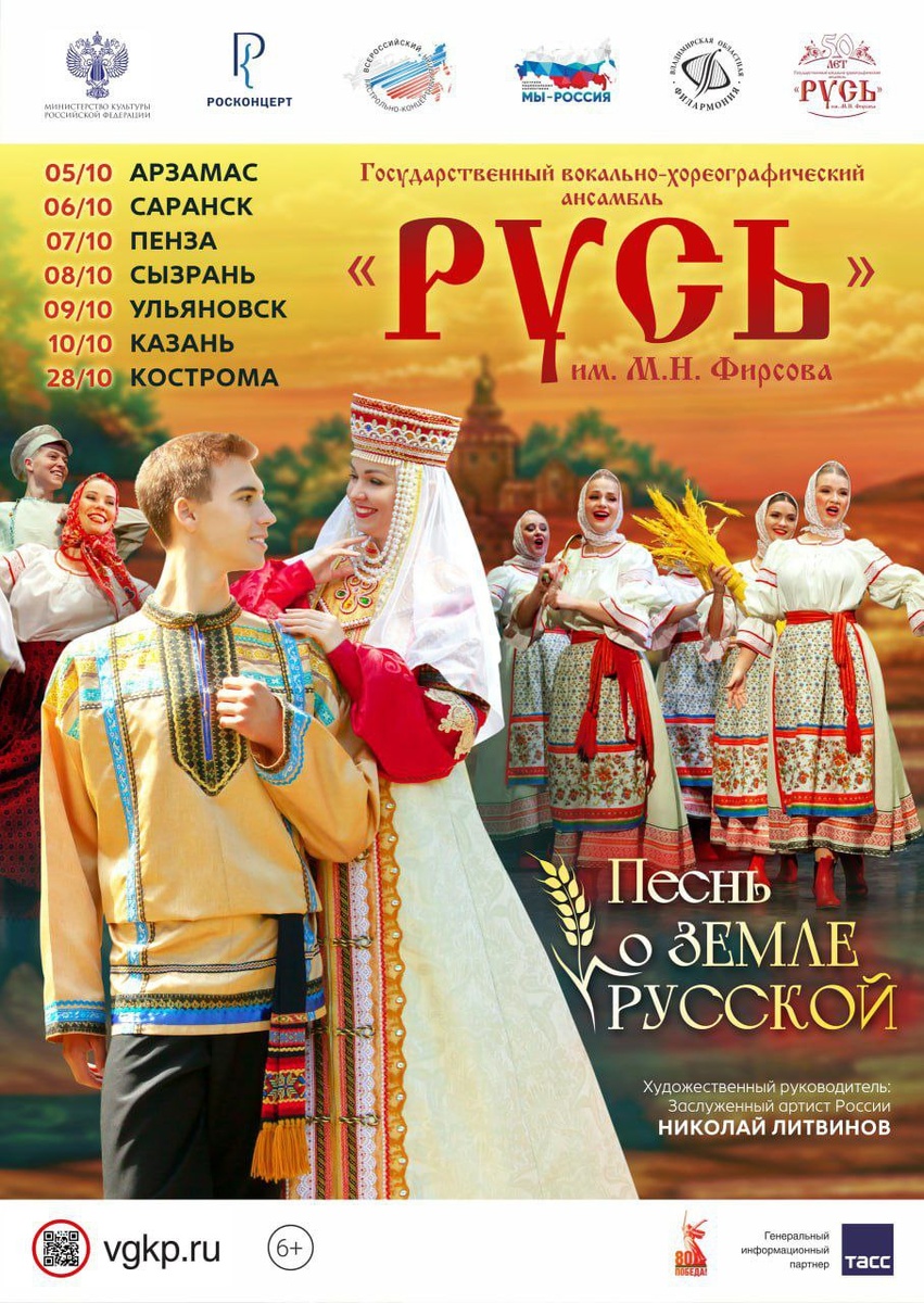 «Песнь о земле Русской» ансамбля «Русь» прозвучит в Поволжье С 5 по 28 октября 2025 года Государственный вокально-хореографический ансамбль «Русь» имени М.Н. Фирсова Владимирской областной филармонии выступит с концертной программой «Песнь о земле Русской» в городах Поволжья. Гастроли стали возможны благодарю участию ансамбля в федеральной программе «Мы – Россия» и включению концертов коллектива во Всероссийский гастрольно-концертный план Министерства культуры Российской Федерации.