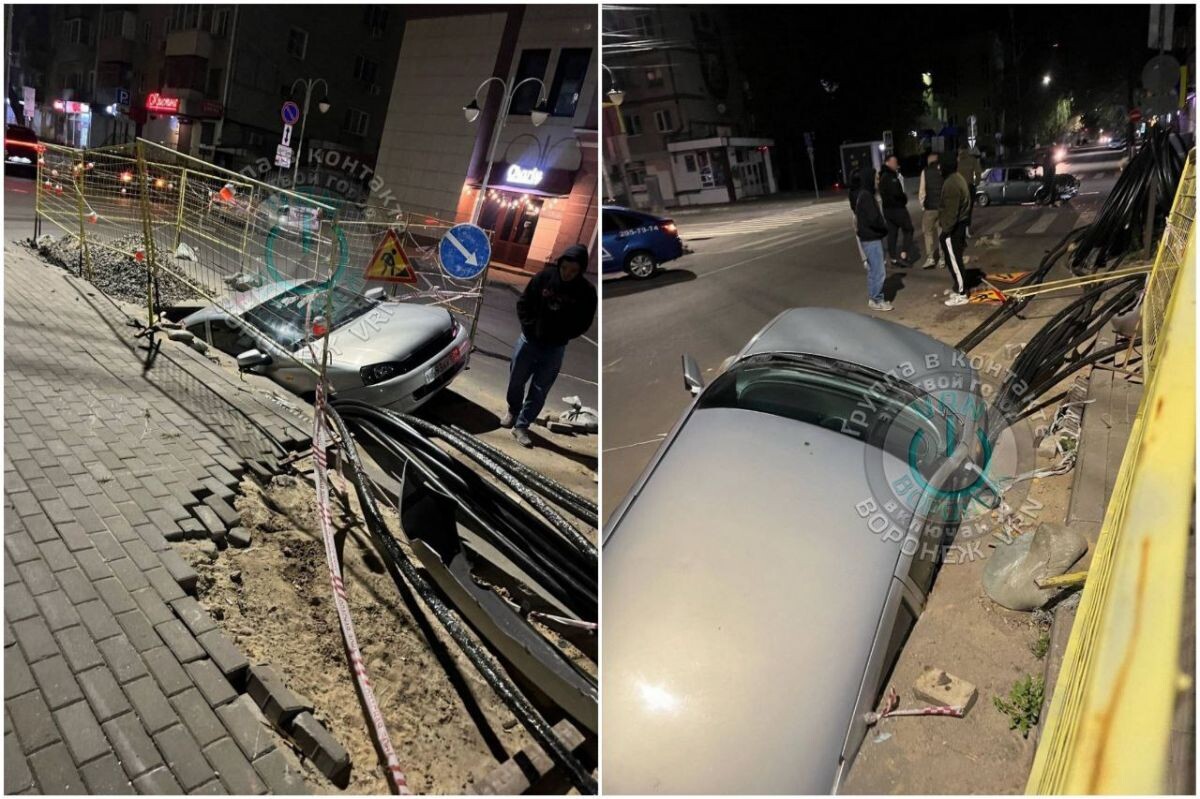 В Воронеже легковой автомобиль оказался в большом котловане. Местные жители поделились кадрами с места происшествия в социальных сетях.