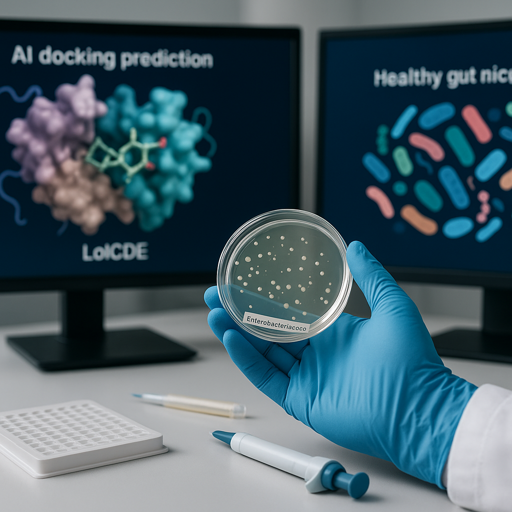 В отличие от классических «широкого спектра» антибиотиков, которые действуют словно ковровая бомбардировка, уничтожая и полезные, и вредные бактерии, энтерололин работает точечно. Он поражает исключительно бактерии семейства Enterobacteriaceae (включая E. coli) и при этом сохраняет микробиом кишечника. Это крайне важно при воспалительных заболеваниях кишечника (ВЗК), таких как болезнь Крона, где баланс микрофлоры — не менее значим, чем устранение инфекции. ⚙️ Роль ИИ: DiffDock как прорыв в фармацевтике