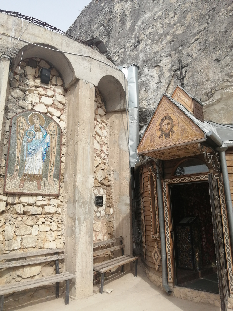 Храм этот "новодельный", расположен на склоне горы Фыцки, совсем неподалеку от прежнего своего месторасположения. История его началась примерно в VIII веке, когда в Крым прибыли греческие гонимые христиане, которые основали здесь пещерный монастырь св. Анастасии Узорешительницы. Разные периоды расцвета и забвения переживал этот монастырь. Были и пожары и разорения и царская милость. Сегодня его называют ещё и Бисерным, потому что иконы и вся отделка выполнены из бисера, что делает храм поистине уникальным. Ну, я по крайней мере таких не видел. Уникальность храма также заключается в том, что в маленьком скиту хранятся частицы мощей 11 святых. Скит расположен на территории действующего монастыря. Рядом, также прямо в скале, строится храм в честь иконы Пресвятой Богородицы «Троеручица». Святая Анастасия жила в Риме в третьем веке и прославилась помощью заключённым в тюрьмы, гонимым христианам (отсюда "Узорешительница"). За что, в итоге, была предана властями страшной казни. Сначала её в