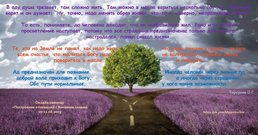 В аду душа трезвеет, ТАМ СЛОЖНО ЖИТЬ. Там можно в масле вариться несколько сот лет. Человека варят и он думает: “Ну, точно, надо менять образ жизни, что-то я, наверно, неправильно делаю”. То есть, понимаете, до человека доходит, что он неправильно жил. Рано или поздно просветление наступает, потому что все страдания предназначены только для одного: настрадался, понял смысл жизни. Те, кто на Земле не понял, как надо жить, что надо лекции слушать, желать всем счастья, что молиться Богу надо, не волнуйтесь, поймете позже, поваритесь в масле и поймете. АД ПРЕДНАЗНАЧЕН ДЛЯ ПОЗНАНИЯ. Иногда человек через знания по доброй воле приходит к Богу, а иногда через страдания. Оба пути нормальные, у кого какие возможности.