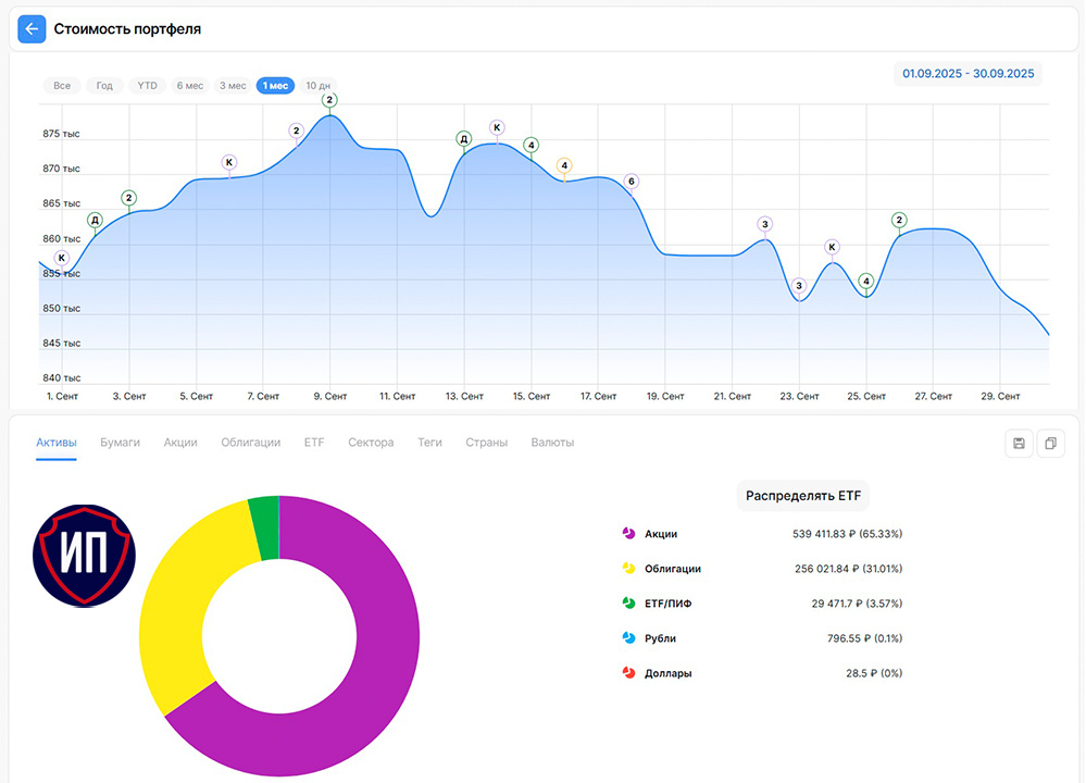 В этом месяце видео с итогами не будет, так как физически не хватает времени, но как же без отчета... Официально, сентябрь стал самым сложным месяцем российского фондового рынка. Геополитические новости настолько сильно влияли на умы инвесторов, что после закрытия летнего дивидендного сезона акции посыпались как сухие листья с деревьев. В итоге индекс Московской биржи за месяц потерял 📉-7,3% - рекордное значение с начала 2025 года. Если падает индекс, то очевидно не стоит ждать роста портфелей у инвесторов с дивидендной стратегией. Что мы можем сделать, так только заблаговременно диверсифицировать портфель и следовать инвестиционной стратегии, чтобы снизить просадку. За счет вышеперечисленного мой публичный портфель сократился на 📉-1,1% до 849 730 рублей. Пу-пу-пу, вроде бы динамика лучше рынка почти в 7 раз, но любой минус он всегда неприятен. 💰Чтобы минус был таким, а не в разы больше я следовал стратегии пополнения портфеля - это был ряд пополнений на общую сумму 34 000 рулей -