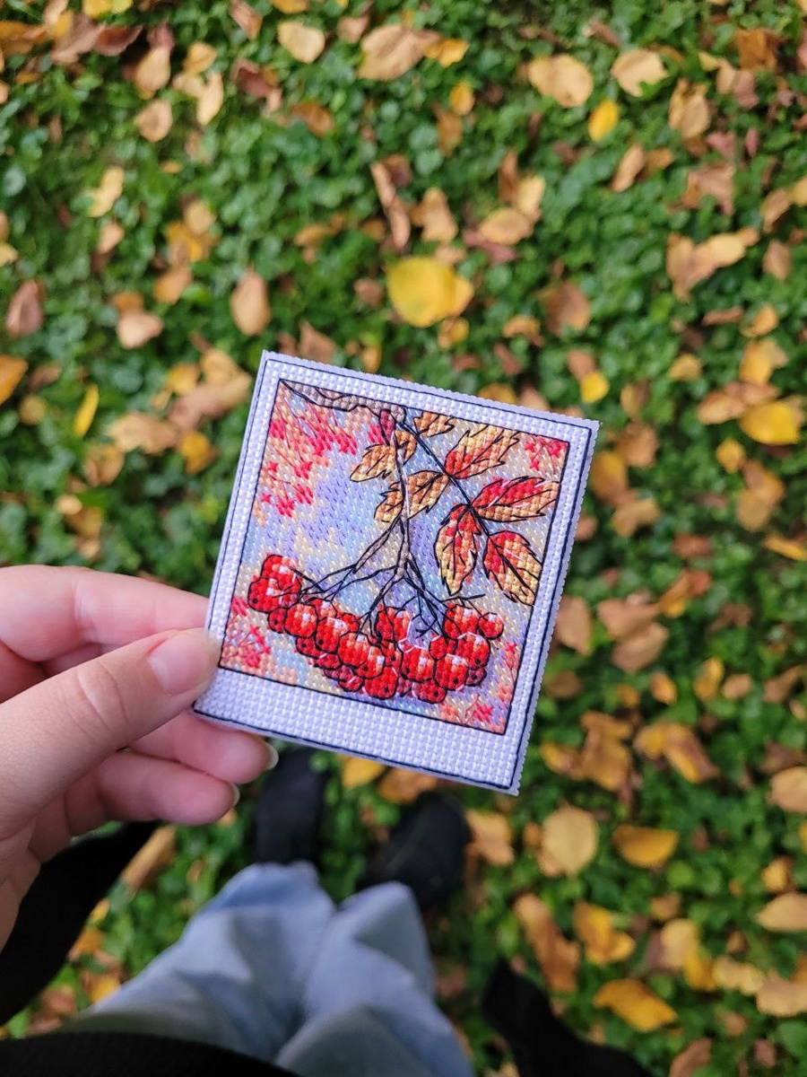 Осенью я постаралась взять курс на сокращение процессов. Конечно, старты все равно есть: я участвую в разных СП, а иногда просто хочется что-то начать. Хотя стараюсь именно хочушки прижимать. До сих пор не начала ничего из покупок Формулы! Еще есть плановые старты, но их пока тоже не трогаю. В этом месяце на видео меня не хватило, поэтому итоговой будет статья. Покупки в сентябре были только на Формуле Рукоделия, про это есть отдельное видео: Финишей было немного – четыре. Два из них – сентябрьские старты. Мне приспичило вышивать что-то осеннее еще в августе. В финишах последнего летнего месяца можно было увидеть баночку от Натальи Ореховой. А сразу после нее я взяла новый старт – рябину от Мира вышивки. Я не помню, кто именно дизайнер, но точно помню, что вышивала из этой серии летом шмелика, а еще видела зимний сюжет. Рябину вышивать мне понравилось, хотела успеть к третьему сентября, но чуть-чуть не уложилась в график. Вышила на пластике и повесила над столом. Размер работы – 1049 с