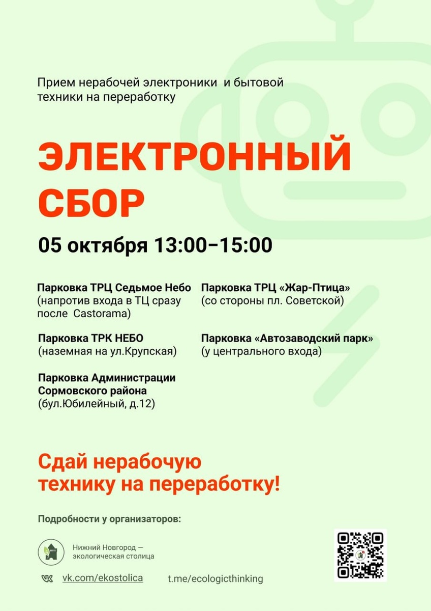 5 октября Экостолица проводит акцию «Электронный сбор» в Нижнем Новгороде и принимает на переработку нерабочую бытовую технику и электронику! В этот день вы сможете сдать на переработку: сломанные мобильные телефоны, нерабочую компьютерную и бытовую технику, провода, компьютерные мыши, игровые устройства, нерабочие инструменты (дрели, шуруповерты и т.д), видео- и музыкальные устройства. Подробный список будет в следующих постах, не пропустите! Важно! НЕ смогут принять: батарейки, лампочки, детские игрушки, диски, пластиковые карты, электронные сигареты. Всё собранное отправится на переработку. 5 октября с 13:00 до 15:00 по адресам: 1. Парковка ТРЦ Седьмое Небо (напротив входа в ТЦ сразу после Castorama); 2. Парковка ТРК НЕБО (важно наземная, на ул. Крупская, через дорогу от ТРК НЕБО); 3. Парковка ТРЦ Жар-Птица (со стороны пл. Советской); 4. Парковка "Автозаводский парк" (у центрального входа); 5. Парковка Администрации Сормовского района (бул. Юбилейный, д.12). 😄 Мероприятия Ниж