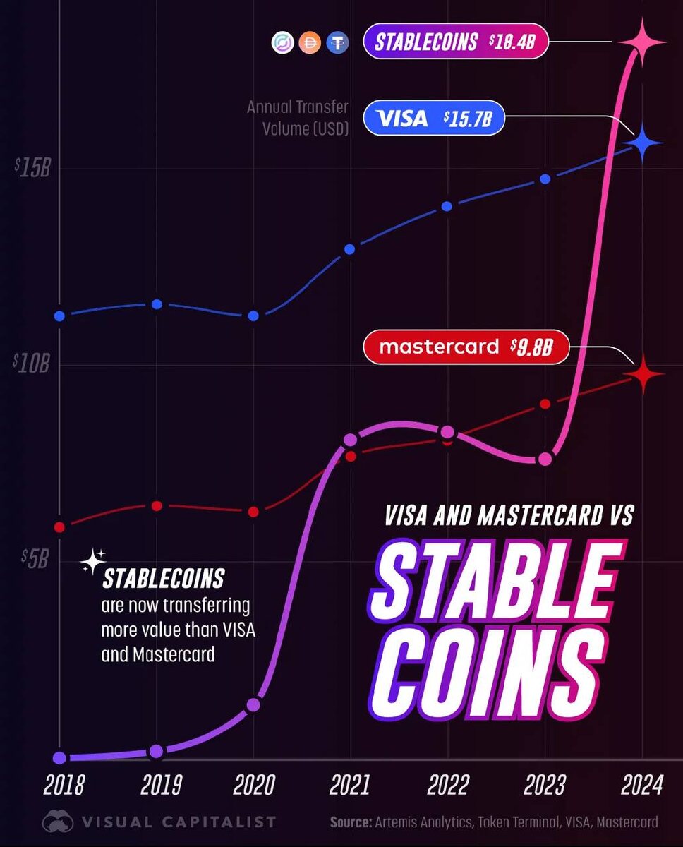 💳 Стейблкоины против Visa и Mastercard: кто король переводов? Вот это поворот.. в 2024 году стейблкоины впервые обогнали по объёмам переводов сразу и Visa, и Mastercard. 👉 $18,4 трлн у стейблкоинов против $15,7 трлн у Visa и $9,8 трлн у Mastercard. Всего за 6 лет с $3,3 трлн в 2018 до $18,4 трлн в 2024. Такой рост трудно игнорировать. Ирония в том, что банки и платежные системы десятилетиями строили свою инфраструктуру, а стейблкоины буквально ворвались на рынок и уже стали главными по транзакциям. ❓И если стейблкоины уже перегнали классические системы по цифрам, сколько времени уйдёт, чтобы перегнать и по количеству пользователей? Финансисты, часто пользуетесь стейблами для переводов? 👍👎 Telegram | YouTube | Все гайды