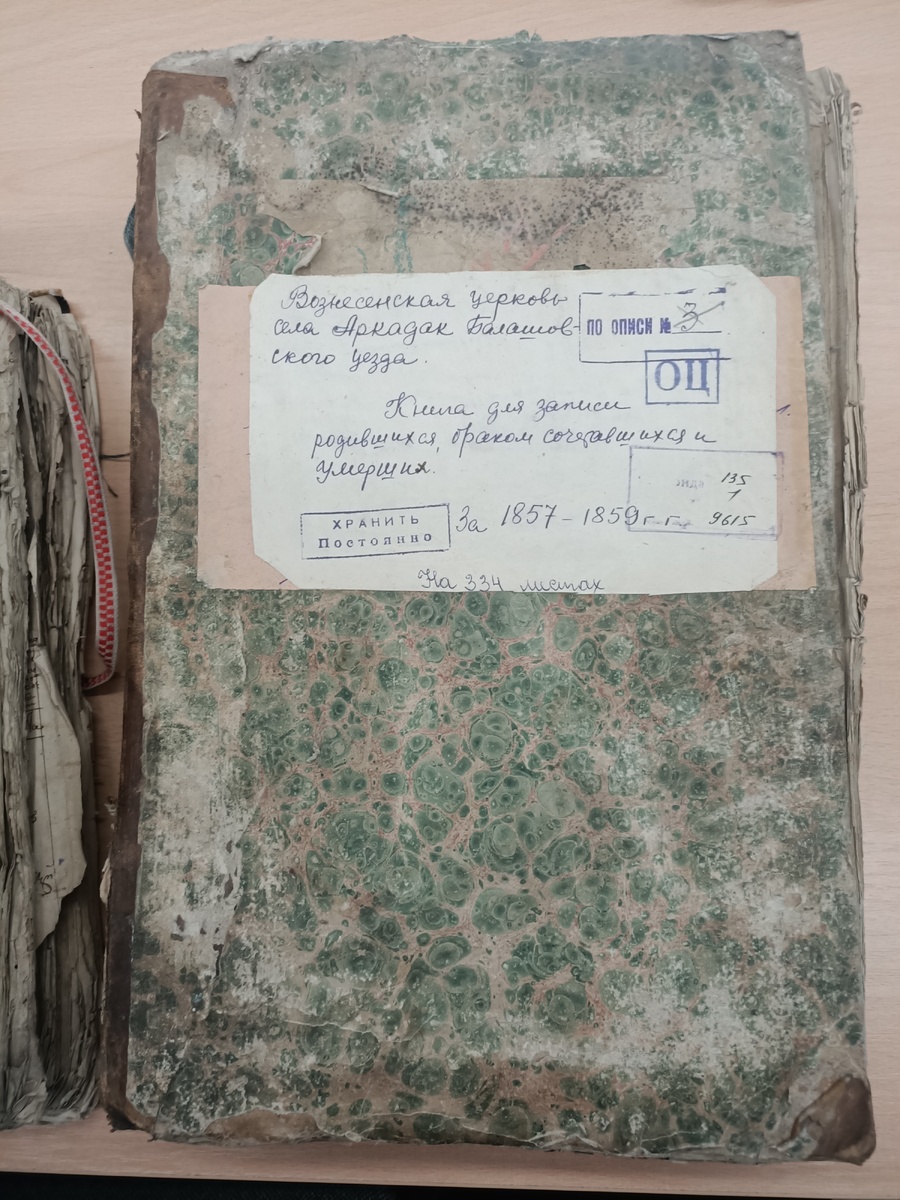 Вот в такой толстой старой метрической книге содержится запись о рождении прапрадеда: Вознесенская церковь села Аркадак 1857 - 1859 г.