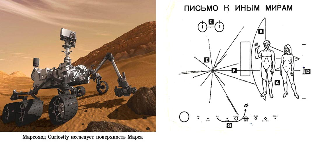 Вера в существовании внеземных цивилизаций не обошла и НАСА. На корпусе американской космической станции Pioneer10, которая в конце февраля 1972 года была направлена к Юпитеру и после выполнения своей миссии набирала скорость, достаточную, чтобы покинуть Солнечную систему, конструкторы прикрепили пластинку-письмо с продуманным рисунком, показывающим внеземному разуму Солнечную систему и с какой из планет запущен космический аппарат, местоположение Солнечной системы относительно четырнадцати пульсаров, частоты радиоизлучения которых указаны в двоичной системе, на фоне космического аппарата изображены обнаженные мужчина и женщина в масштабе длины волны 21см парадоксальногпо радиоизлучения нейтрального водорода, заполняющего Вселенную.