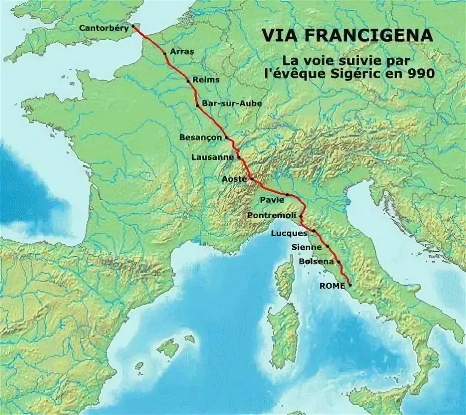 Камино, конечно же, не единственный паломнический маршрут в Европе. Второй по известности и возрасту маршрут - это Дорога франков. "Все дороги ведут в Рим". Вот и Дорога франков ведет путников в Рим. Впервые этот маршрут упоминается в пергаменте 876 года, хранящемся в одном из монастырей Тосканы. Там расписан этот путь с севера Италии в Рим к Святому престолу и гробницам апостолов Петра и Павла. Полный маршрут, начинающийся из Кентербери и заканчивающийся в Италии через Большой перевал Сен-Бернар, был подробно описан архиепископом Сигериком, поэтому именно его и считают «настоящим» Via Francigena. В 990 году по пути из Кентербери в Рим он сделал 80 остановок, останавливаясь на ночлег в основном в монастырях. После этого Via Francigena стала общепринятой паломнической дорогой. Пилигримам нужно было пересекать Альпы и Аппенины (Большой перевал Сен-Бернар) - это самые сложные участки этого пути. Сейчас по Via Francigena так же, как и тысячу лет назад, идут паломники. У дороги