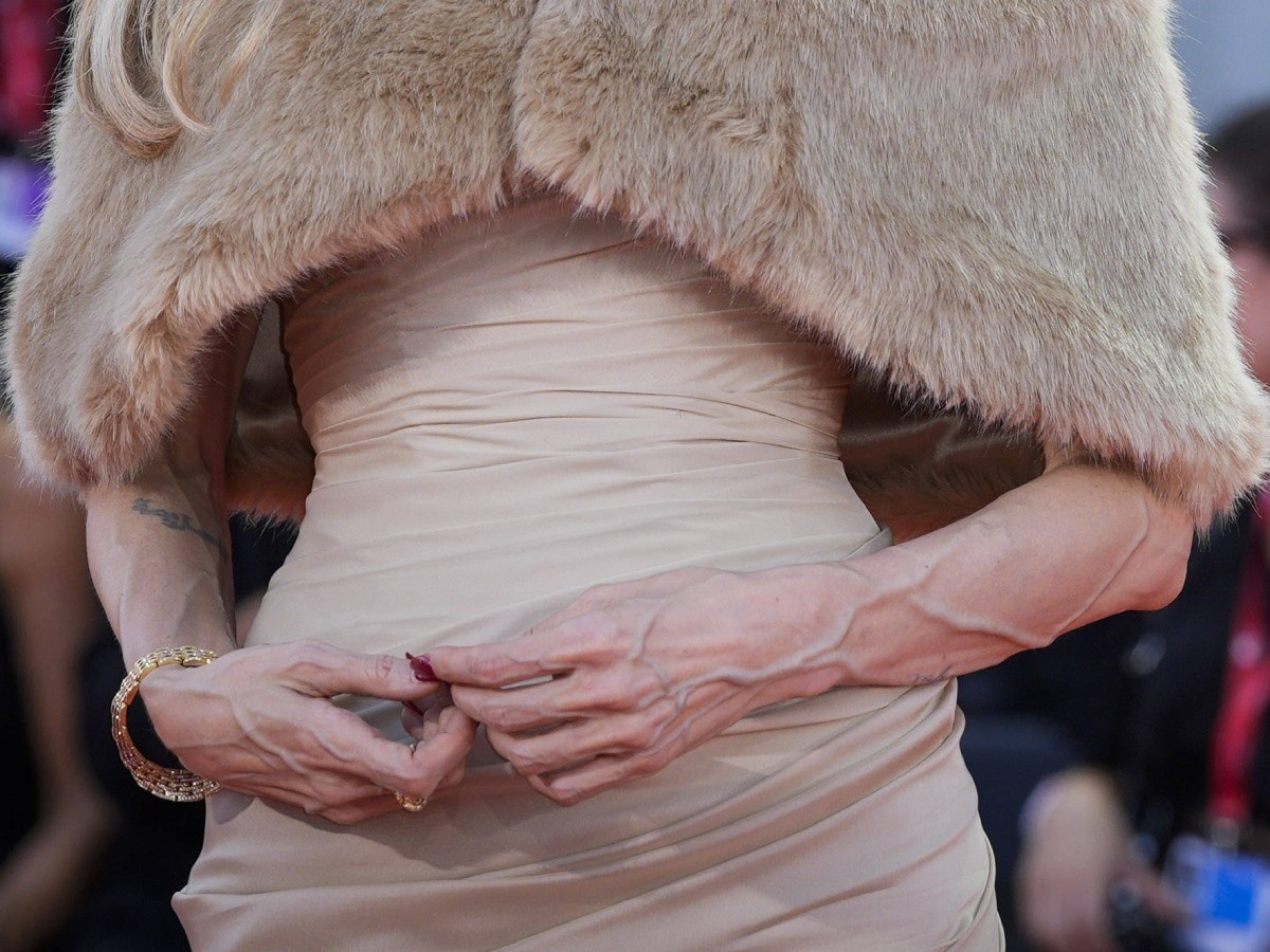 На Венецианском кинофестивале Анджелина Джоли предстала в роли Марии Каллас в байопике "Мария", но внимание публики приковали не только ее актерская игра, получившая восьмиминутные овации, но и вид рук актрисы, которые под светом софитов показались усохшими с вздувшимися венами, создав контраст с ее классическим образом в песочном платье Atelier Versace и винтажном меховом манто.