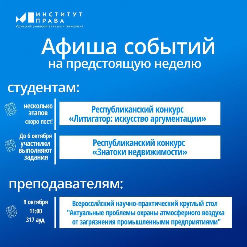 📢 АФИША 🔹 С 1 по 31 октября — не упусти шанс проявить себя в Республиканском конкурсе «Литигатор: искусство аргументации»! Это твой момент блеснуть навыками юридической риторики и аналитического мышления. 📄 Подробности — в информационном письме. Следи за новостями — впереди отборочные этапы и интересные задания! 🔹 Напоминаем: набор заявок на Республиканский конкурс «Знатоки недвижимости» завершён. До 6 октября пройдёт отборочный этап — желаем участникам удачи! 📄 Всё о конкурсе — в информационном письме. 🔹 9 октября в 11:00, ауд. 317 — Всероссийский научно-практический круглый стол: «Актуальные проблемы охраны атмосферного воздуха от загрязнения промышленными предприятиями». Приглашаем студентов, магистрантов и всех, кому небезразличны экологическое право и устойчивое развитие! 📄 Подробности — по ссылке. 📎 А ещё! Прикрепляем дайджест мероприятий на октябрь от других организаций - не пропустите возможности поучаствовать в конференциях и конкурсах! Смотрите в комментариях!