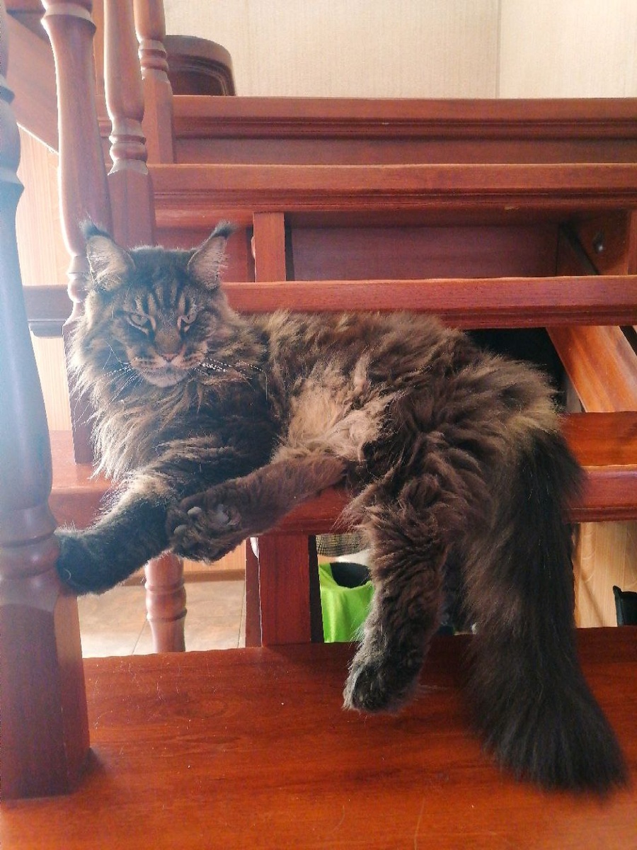 Порода: мейн-кун, крупный, черно-серо-белого окраса.