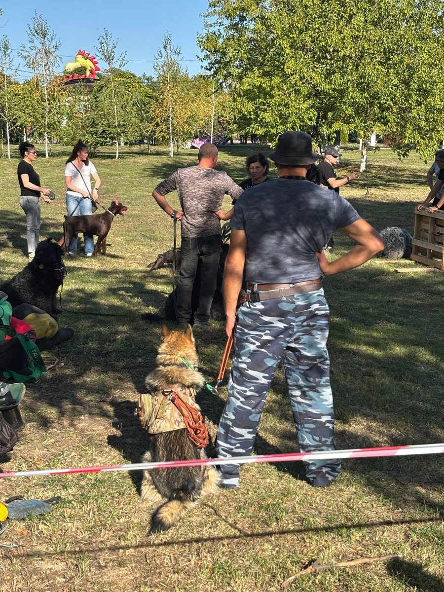 На празднике для жителей и гостей района проходят показательные выступления собак