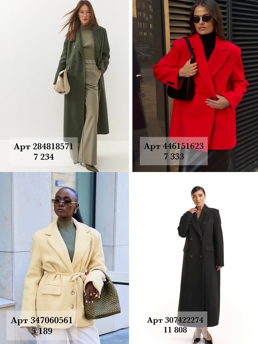 - Для акцента: алое пальто (арт. 446151623) или необычный жакет с накидкой-воротником (арт. 496303684).