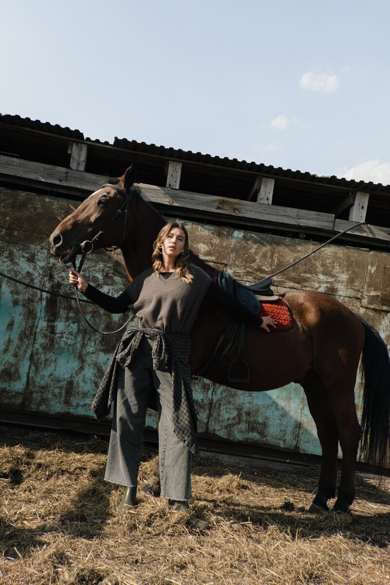Баланс спокойствия и силы для конной прогулки находим в сочетании согревающего жилета из шерсти, рубашки в клетку и мягкого лонгслива с прямыми джинсами